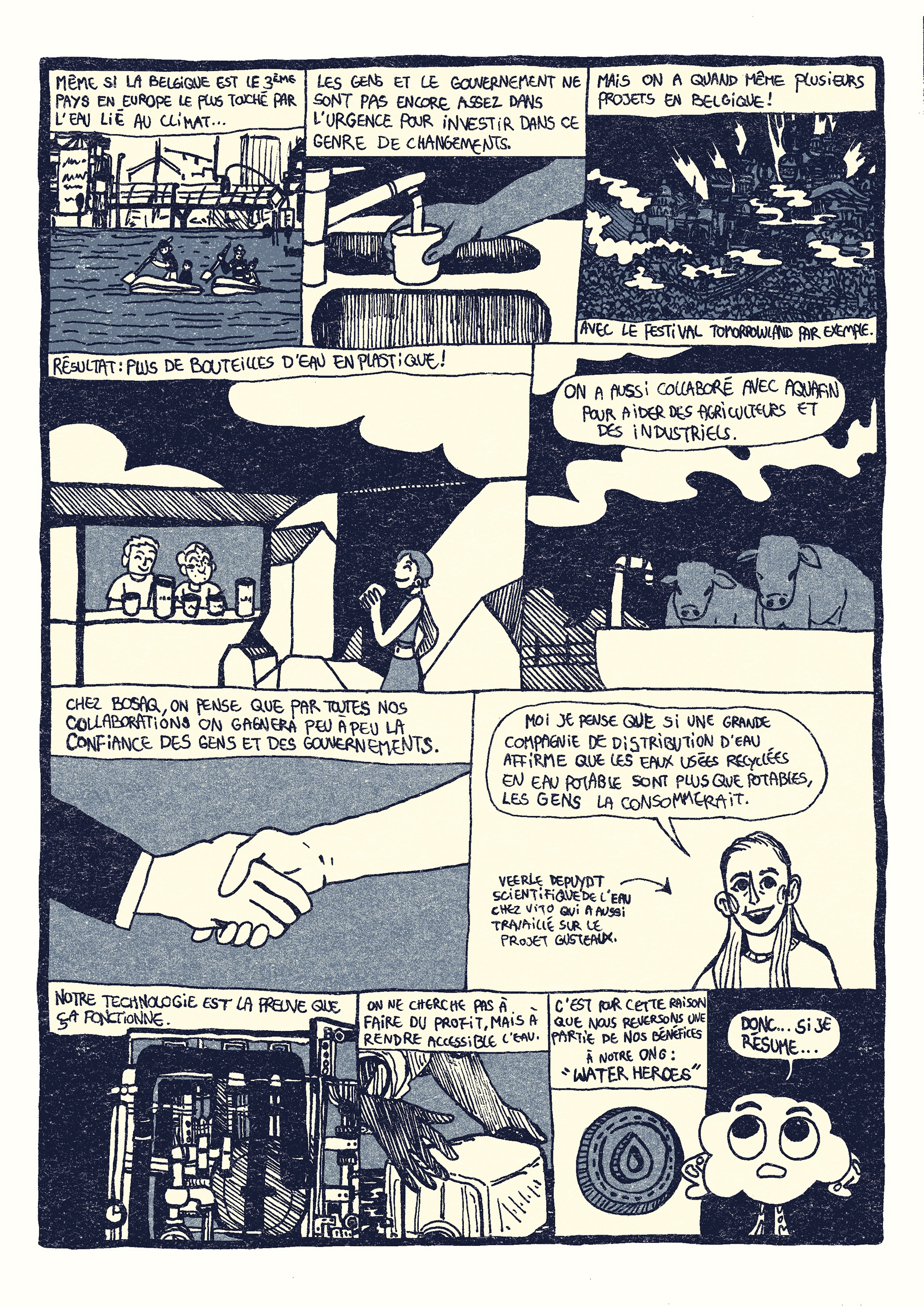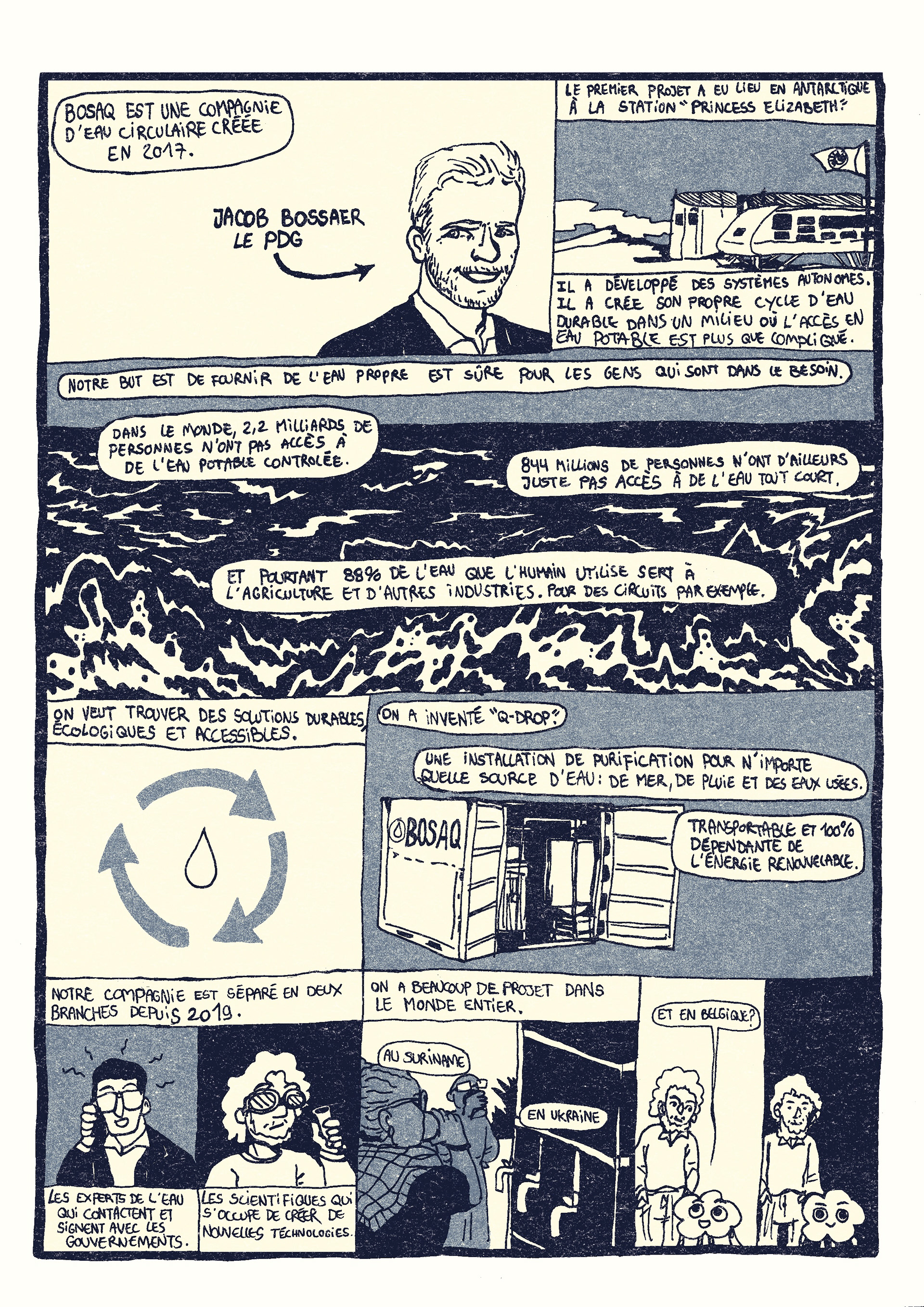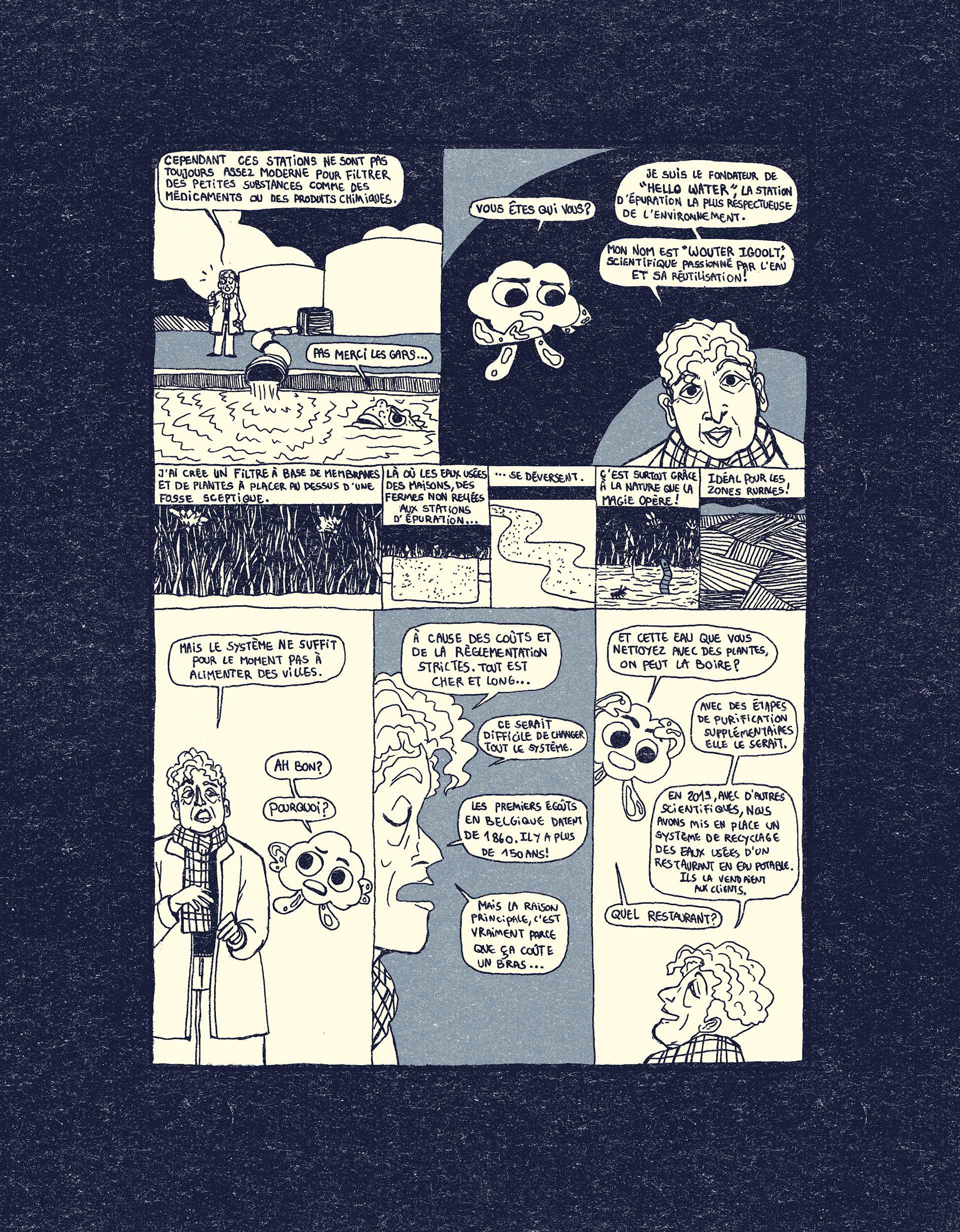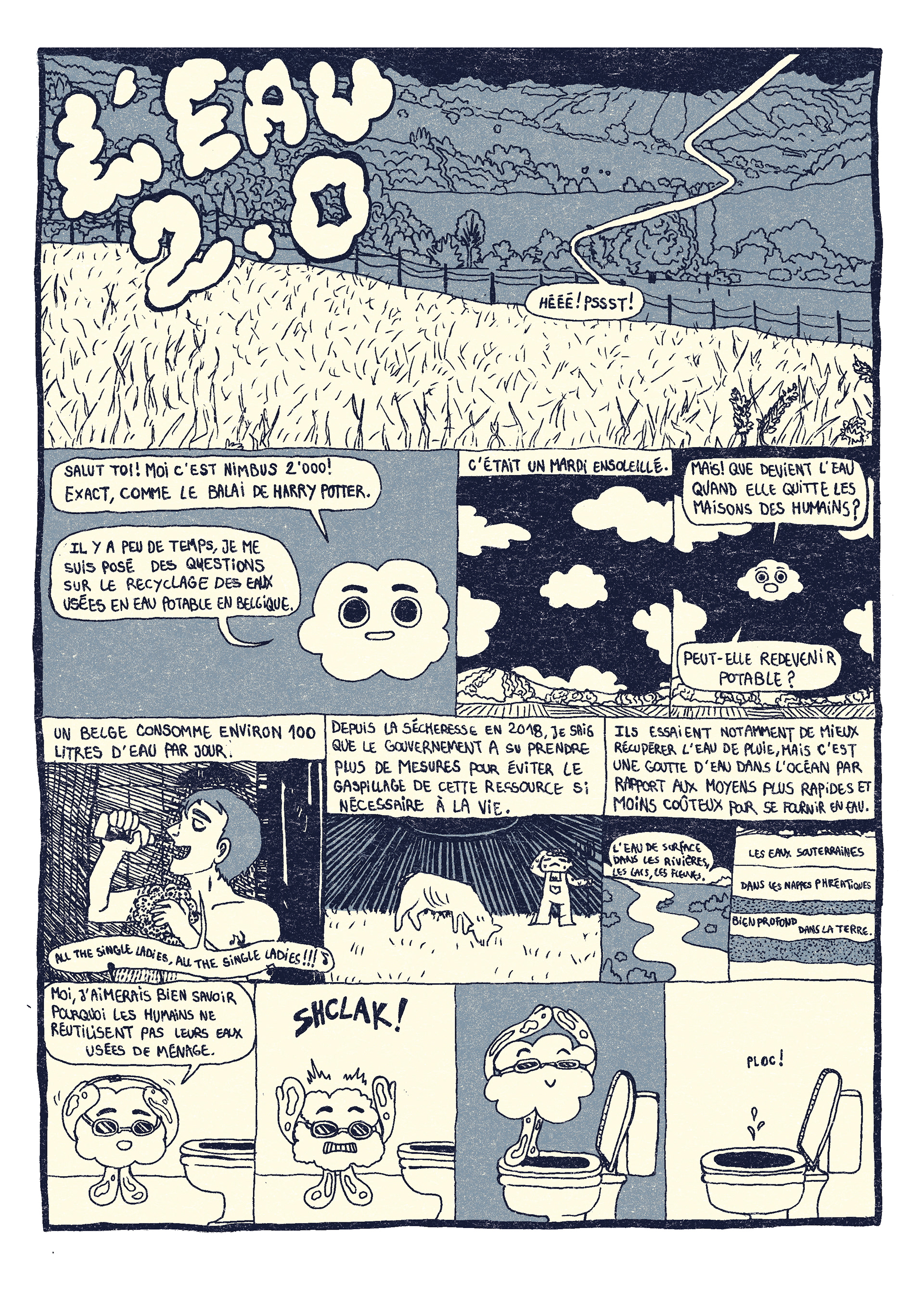 A comics reportage about recycled wastewater transformed into drinking water in Belgium. This was my first project as part of my Master’s degree at ESA St-Luc (2024). As someone introverted, I found it difficult yet enriching to take on the role of journalist: conducting interviews, field research, and transforming complex scientific information into comics. The project is still in progress, as I continue revising certain terms with feedback from the scientists I met.