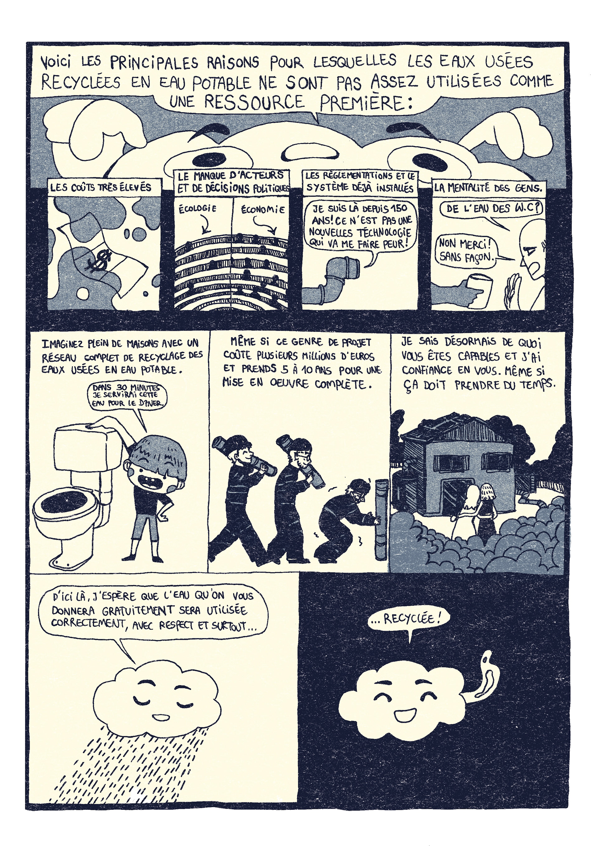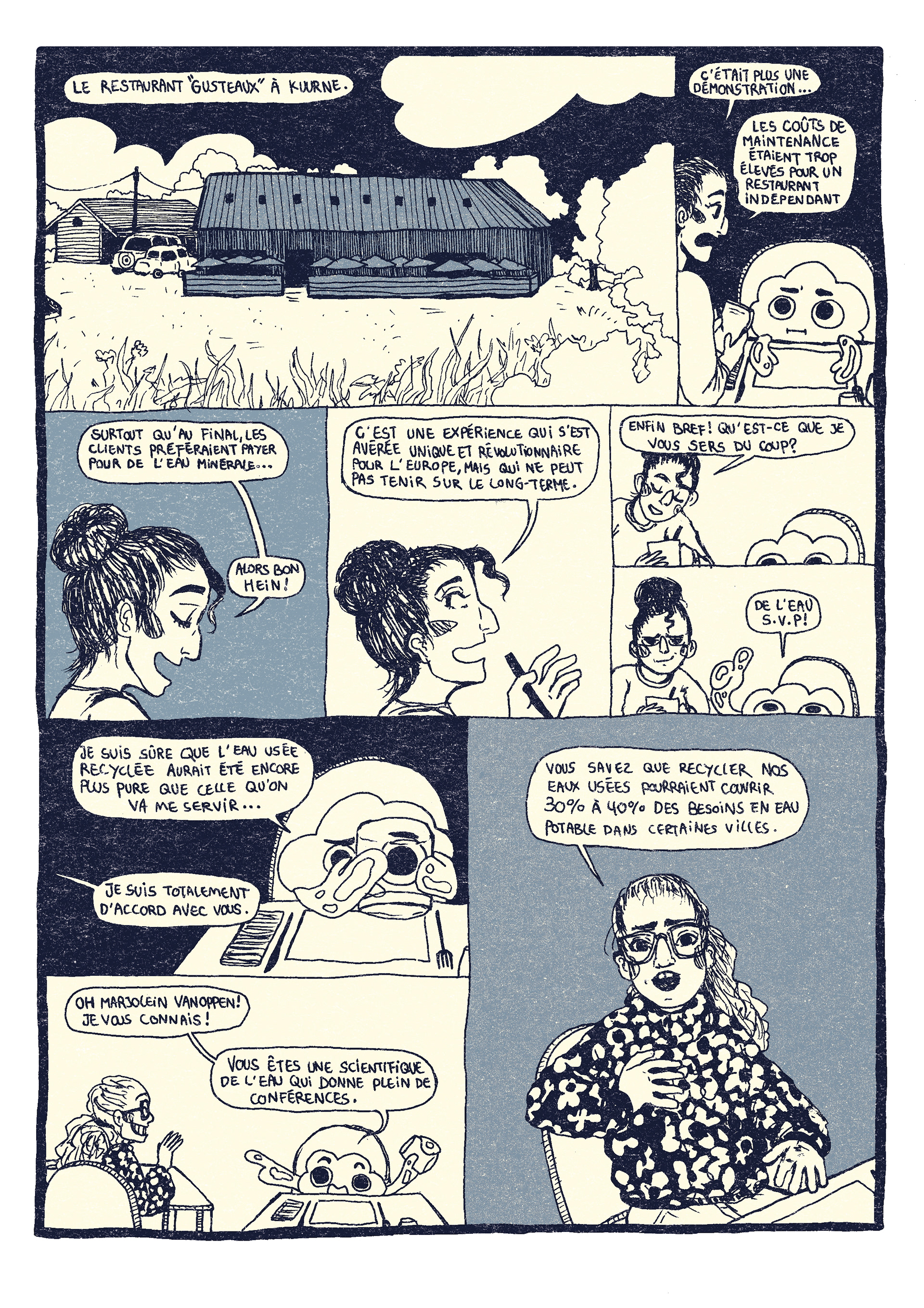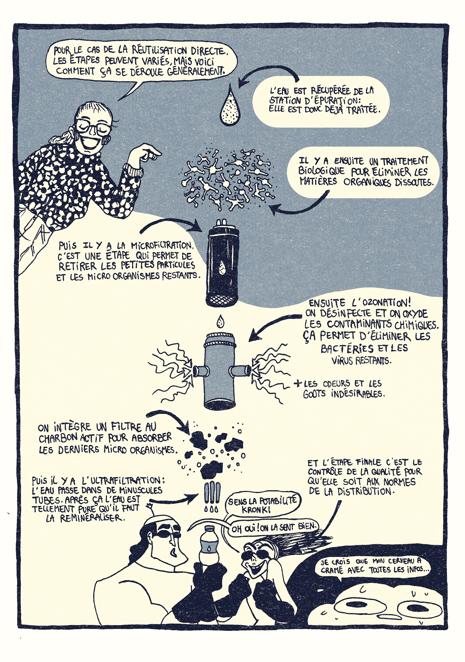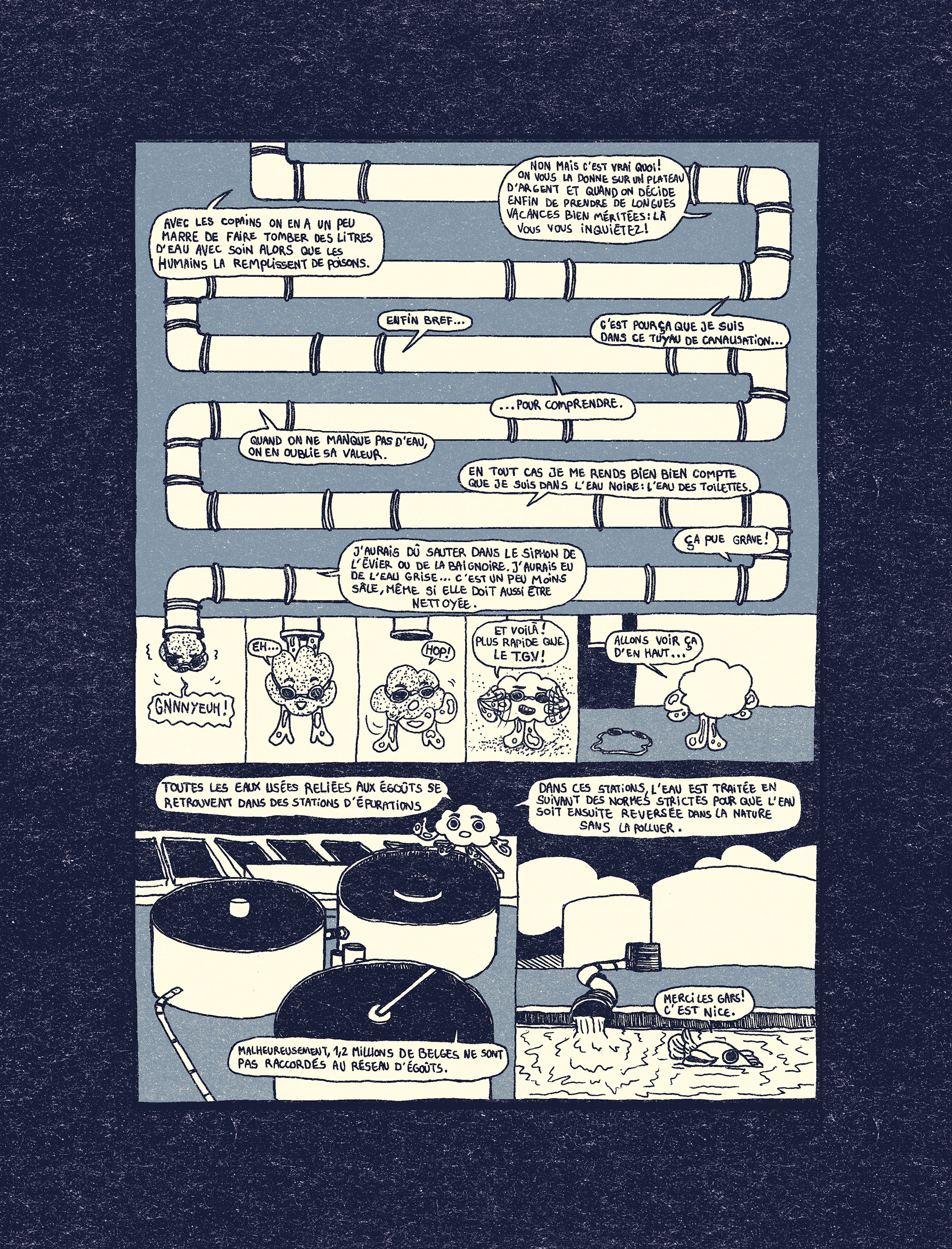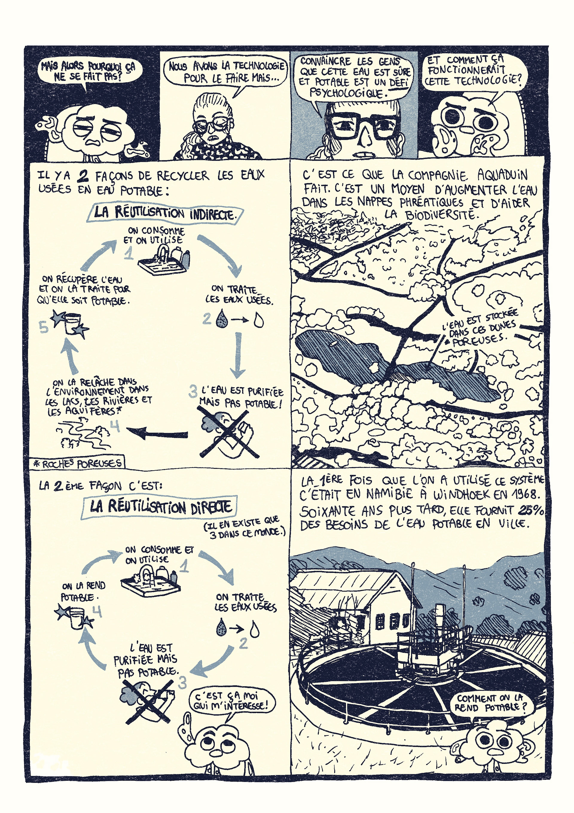 A comics reportage about recycled wastewater transformed into drinking water in Belgium. This was my first project as part of my Master’s degree at ESA St-Luc (2024). As someone introverted, I found it difficult yet enriching to take on the role of journalist: conducting interviews, field research, and transforming complex scientific information into comics. The project is still in progress, as I continue revising certain terms with feedback from the scientists I met.
