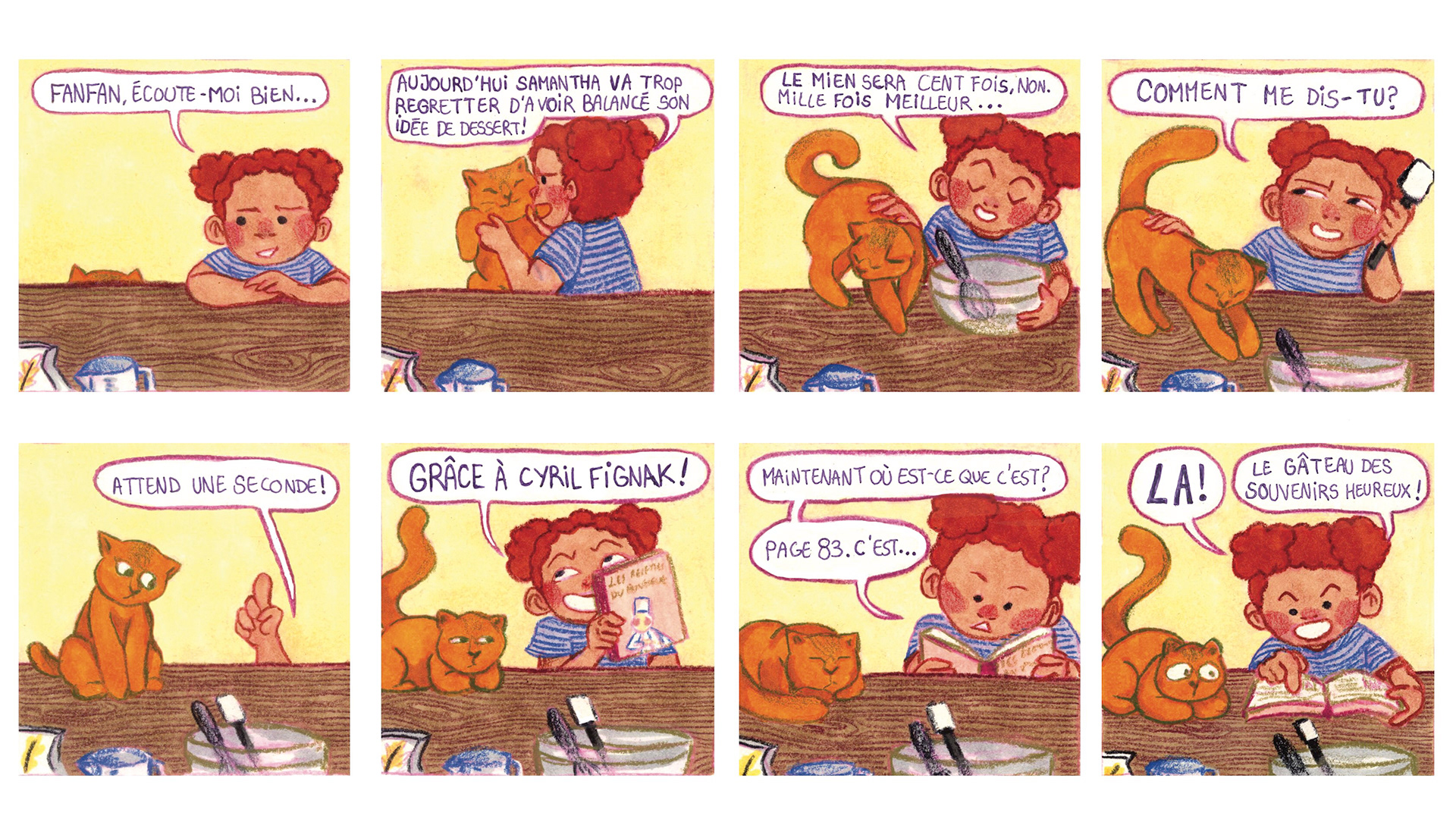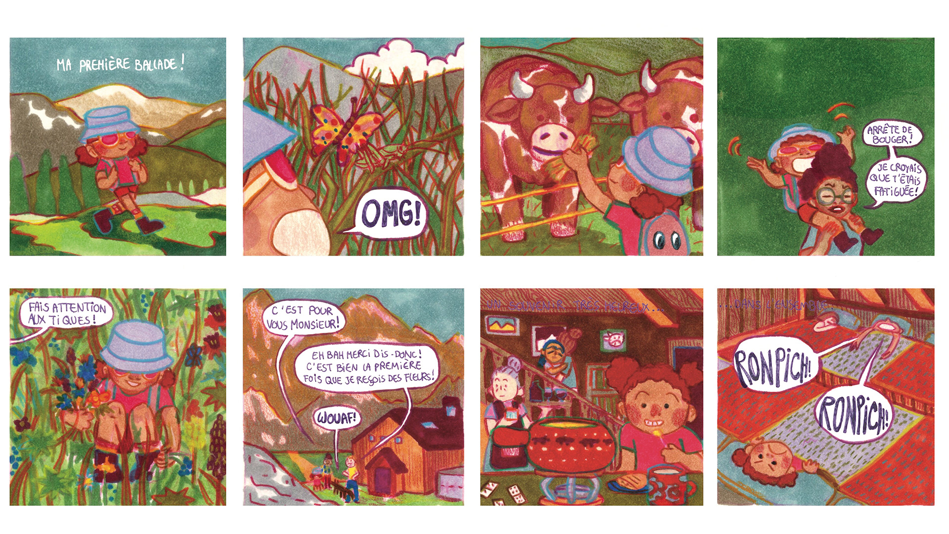 To outshine Samantha, her nemesis with whom she must share a birthday celebration at school, ten-year-old Candice decides to bake a cake where each layer embodies a happy memory from her life. La recette du bonheur (french for The Recipe for Happiness) is a children’s graphic novel created during my first year of the Master in Comics program at ESA St-Luc. Intended for both children and nostalgic readers, the story gently explores themes of happiness and human connection. Presented in the form of a graphic novel, it alternates between narration and flashbacks, brought to life with soft, colorful illustrations using alcohol markers and colored pencils. I had three months to imagine the story, create the pages, and produce the book. This project served as a test for a future universe to be developed, since there is still much to review.